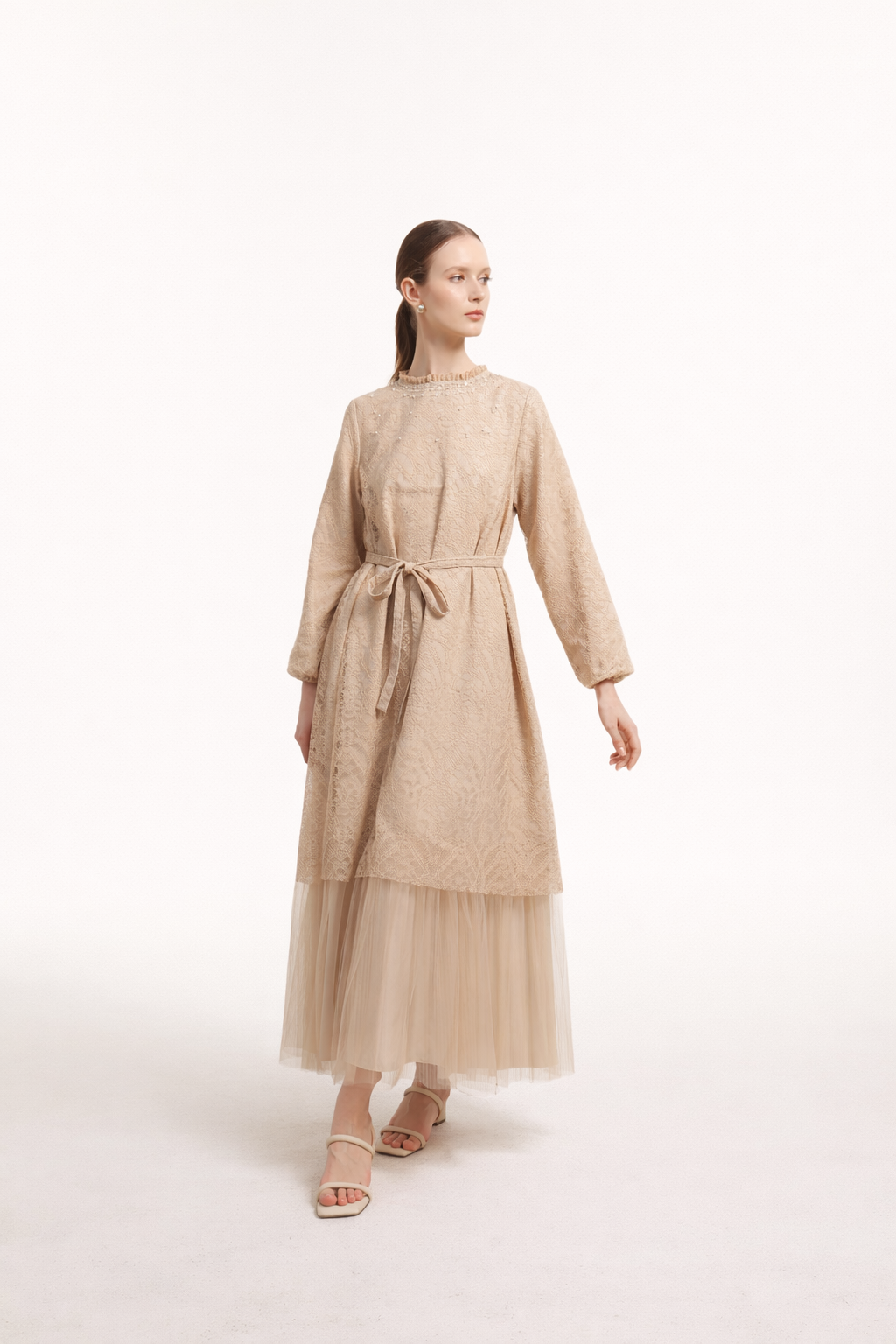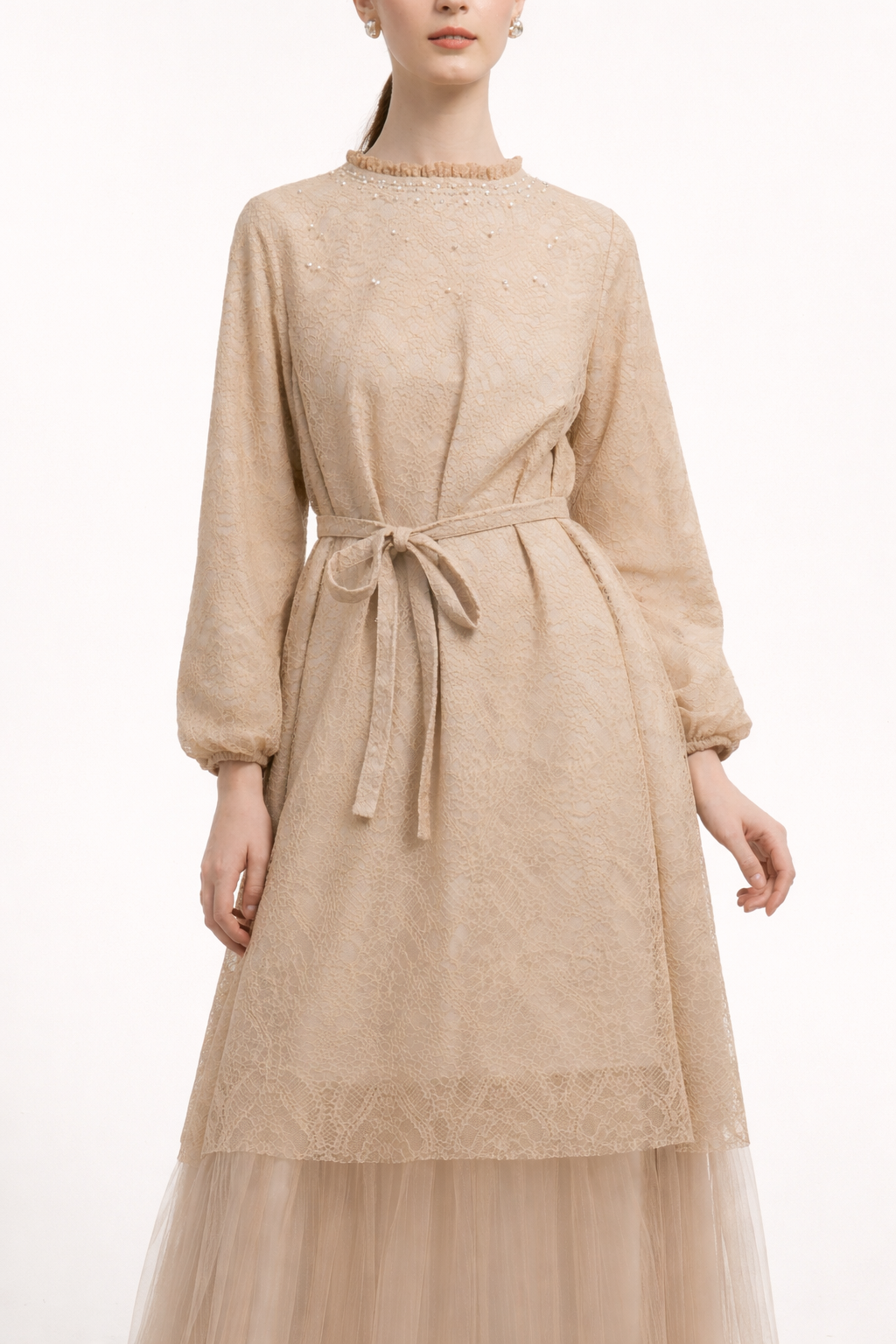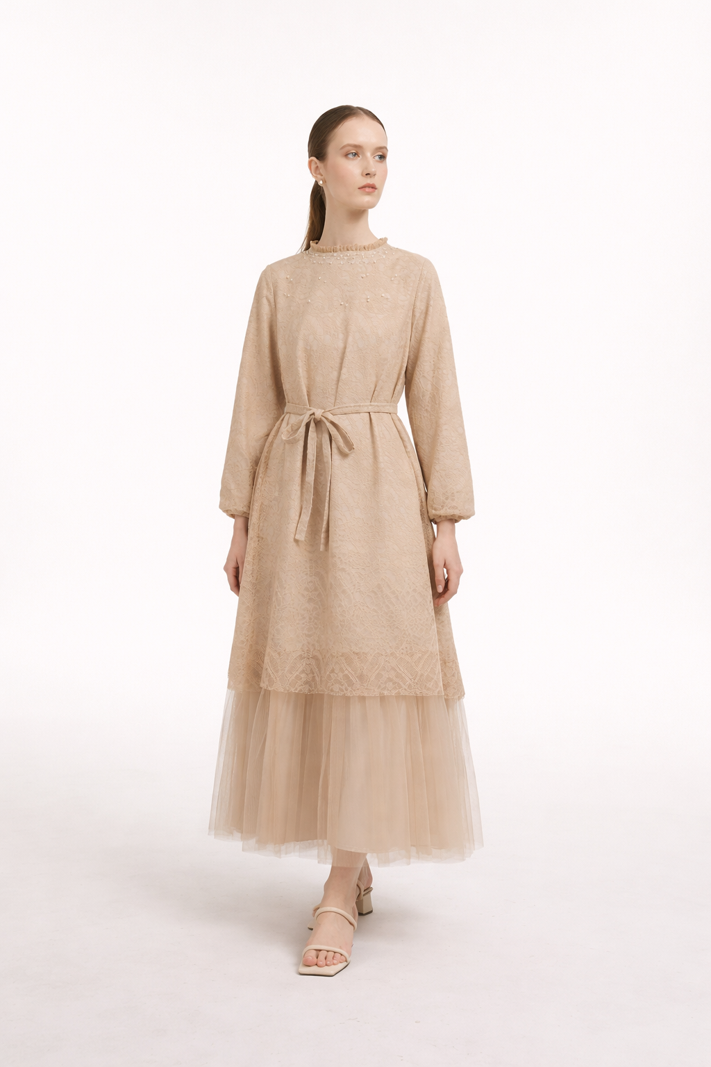 - Model tunik panjang dengan layer rok tulle